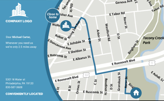 Maps4Mail offers you personalized variable maps that are different for each address in your mailing. Show several of nearby store locations or highlight the route from a customer’s home right to a store. Our attention-getting maps work for any industry – they can drive customers to your business.